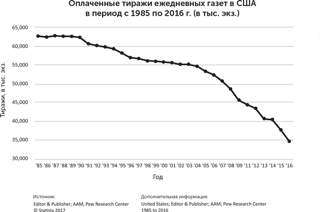 22 января 1996 г. газета The New York Times начала выходить онлайн, предоставив непосредственный доступ к своим новостям и публикациям читателям по всему миру. В период с 1990 по 2015 г., когда читатели начали активно переключаться на интернет, тиражи американских газет упали на 37 %, а 2005 г. стал худшим для газетчиков, когда спрос на бумажные газеты начал стремительно падать{21}.