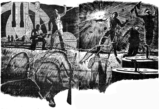 Тысяча футов открытого и пустого поля отделяла их от космического корабля. Напрягая глаза, они видели, как в лунном свете крошечные человеческие фигурки снуют вокруг его основания, образуя своеобразный защитный круг. По всему полю зажглись прожекторы, не оставившие ни тени. Немцы знали или боялись, что невидимые нападающие пробрались внутрь их цитадели.