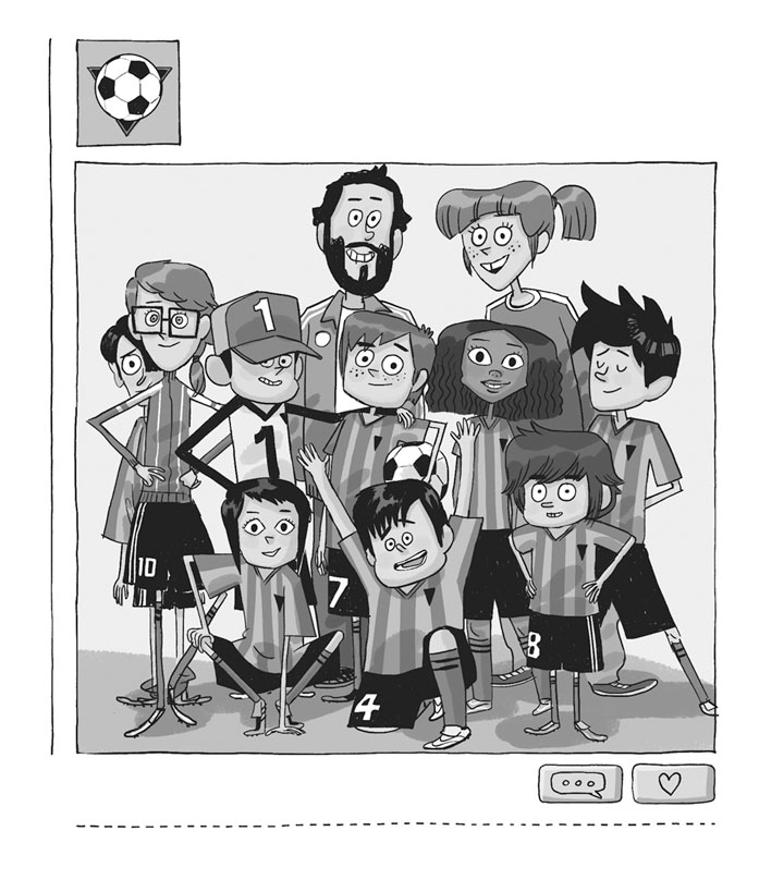И наконец, номер 10, Анита, вратарь запаса, которая никогда раньше не была вратарём, а просто убедила маму забрать её из балета и записать в футбол, который ей больше нравится. Анита носит очки и совсем не видит мяча, даже когда он летит прямо в неё. Но так как она запасная, до нынешнего дня это нас не беспокоило.