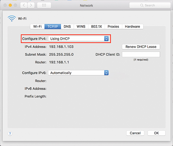 Включение функции получения настроек сетевой карты от DHCP сервера на MAC OS