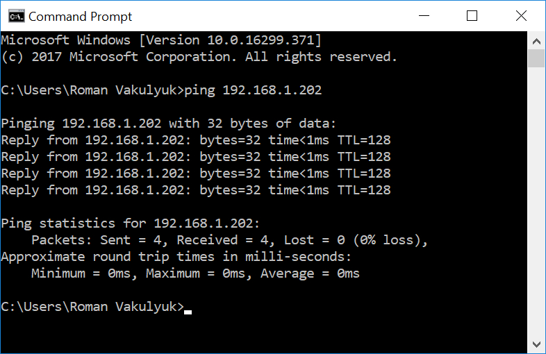 Для этого в Windows системе необходимо открыть приложение командной строки. Чтобы это сделать, нажмите сочетание клавиш Win+R, в окне «выполнить» введите cmd, далее нажимаем кнопку OK. Перед вами откроется окно командной строки. Чтобы проверить подключение между вашим компьютером и другим клиентом, введите команду ping 192.168.1.202 и нажмите Enter. Соответственно, вам нужно вести тот IP адрес, связь с которым вы хотите проверить. Если все успешно, то в отчете пинга адреса вы увидите Received=4; Lost=0; В противном случае командная строка выдаст вам отчет, где либо частично, либо все пакеты были потеряны. Это означает, что клиент с этим IP адресом недоступен или имеет какие-то неисправности с сетью.