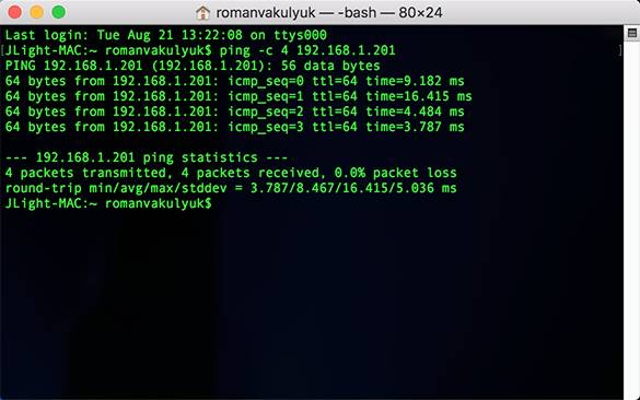 Чтобы сделать такую же проверку в операционной системе MAC OS, необходимо открыть приложение терминала. Для этого зайдите в папку с вашими установленными приложениями и откройте приложение Terminal. Для проверки соединения с клиентом введите команду ping -c4 192.168.1.201. По итогу вы также получите отчет о пинге адреса. Если все в порядке, то вы не потеряете ни одного пакета, и терминал выдаст сообщение 0.0% packet loss. Это означает, что соединение работает корректно.