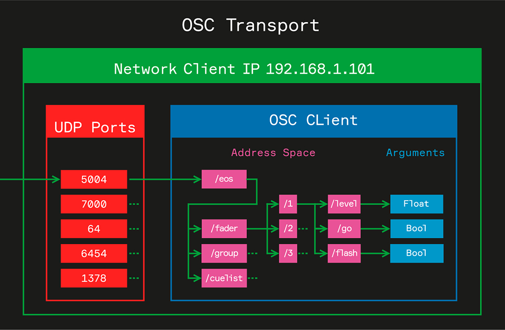 • OSC использует протокол передачи данных UDP и TCP. Эти протоколы обязывают нас указывать IP адрес и порт клиента, что дает нам множество преимуществ. К примеру, мы можем на одном сетевом клиенте синхронизировать несколько приложений одновременно, используя один и тот же IP адрес, но при этом разные порты. Это также позволяет нам настраивать сложные маршруты, делить OSC сигнал или получать на одного клиента сообщения с разных источников без использование дополнительного оборудования, так как этот функционал уже заложен в сетевых протоколах группы TCP/IP.