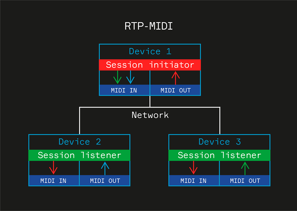 RTP (Real-time Transport Protocol) – это протокол высокого уровня, который базируется на UDP, но при этом имеет свои преимущества, которые были специально разработаны для стриминга аудио и видео. Основная его особенность в том, что каждый пакет данных этого протокола имеет в заголовке абсолютное время отправки, которое может прочитать принимающее устройство и определить задержку и порядок доставки сообщений. Такие преимущества идеально подошли для MIDI, и в 2004 году на свет появилась первая версия протокола RTP-MIDI. Позже компания Apple включила этот протокол в состав своих операционных систем и активно дорабатывала его. И как следствие этого, протокол получил второе название Apple MIDI. Позже был написан отдельный драйвер для Windows и Linux, который также позволял использовать протокол в этих системах.