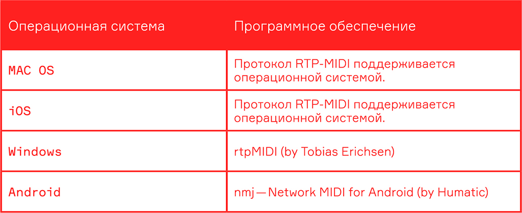 Ниже представлен список операционных систем и название программ, которые добавляют в систему возможность работы с протоколом RTP-MIDI.