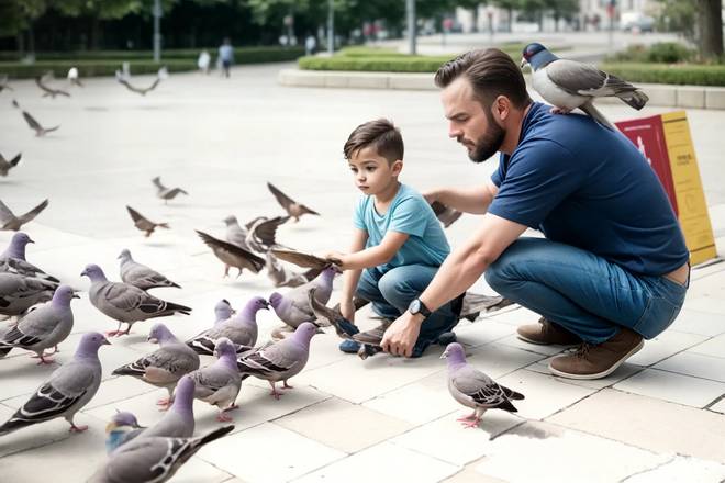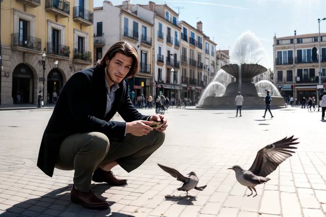 Highly realistic street photography: in the foreground, a young man in a suit feeds pigeons while squatting. Birds walk on the paved square. In the background a fountain is working in the square of a European city. Perfect face anatomy, ideal realistic hands and fingers, perfect human-like skin texture. Highly realistic texture of buildings, pavement, fountain water, and people’s figures. A composition with an energetic, unusual angle. Natural street light in the afternoon, after 5 p.m. , the indirect rays of the sun give a soft, but at the same time dynamic lighting of the picture. The long telephoto lens is mounted at a wide angle to create depth and a sense of perspective in the frame. Zoom in to show the man as the center of the shot: focus on his solitary figure. -ar 3:2, HQ, -testp,8k, -beta -beta -beta.