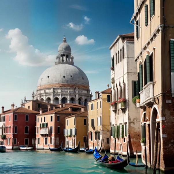 «Захватывающий и незабываемый вид. Старинные венецианские палаццо с их кое-где обшарпанными стенами – словно метафора хрупкости рукотворной красоты перед лицом неумолимого хода времени. В то же время купол, вознесшийся к небу – символ гордого, бессмертного человеческого духа. Все эти дома – как отдельные ноты, каждое со своим характером, но благодаря каналу они слились в один благозвучный аккорд: вода, наполняющая Венецию, и является той вечной незримой связью, которая позволяет зданиям гармонично сосуществовать друг с другом и вести свой безмолвный монолог. HQ, 8k, -testp, -upbeta -beta -upbeta».