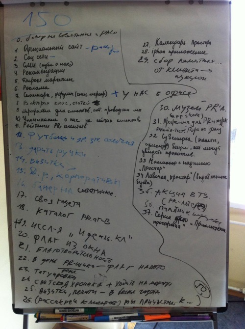 Вот, например, наша доска с идеями: раскруточные идеи для PR-агентства «ПРОСТОР». Как я и говорил, где-то на 70-м варианте появились следующие веселые штуки: летом сделать трафарет для тела «Простор» и фирменно загореть по нему; специальная рекламная набойка у обуви, оставляющая следы с логотипом фирмы. Коктейль для креатива «Простор» в одном из престижных дорогих ночных клубов. Еще была идея вывесить флаг из окна офиса: просто, но весело. Чуть было не вывесили – флаг куда-то запропастился.