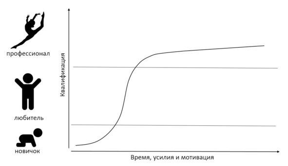 Но давайте вернемся к самообучению. Если на волне интереса к новому вам удастся заняться своим обучением, то вы переходите на следующую стадию, когда и возможен основной рост вашего профессионализма. Назовем ее стадией любителя. Постепенно в процессе обучения наша квалификация заметно возрастает. Одновременно с этим в голове у нас появляется определенный порядок – программа нашего автоматического поведения.
