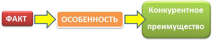 НЕ СТОИТ – сразу перечислять все ФАКТЫ, которые ты знаешь о своём товаре, предмете, игрушке, и потом перечислять все ОСОБЕННОСТИ, а потом все КОНКУРЕНТНЫЕ ПРЕИМУЩЕСТВА. Так будет теряться логическая связь между ФАКТОМ-ОСОБЕННОСТЬЮ-КОНКУРЕНТНЫМ ПРЕИМУЩЕСТВОМ.