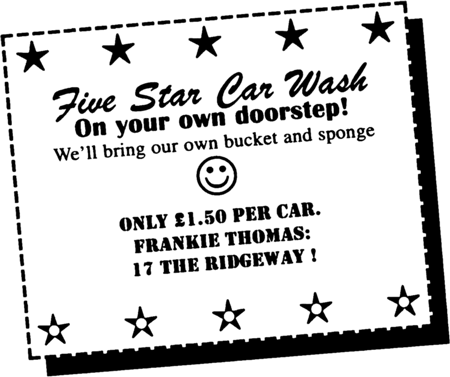 After that we all cycled round to Kenny’s house and persuaded her mum to let us clean her Fiesta. And then Kenny’s next-door neighbour, Bert, who’s really nice, said we could do his. We didn’t charge him as much because he’s a pensioner. But by the end of the afternoon we’d each made $1.25.