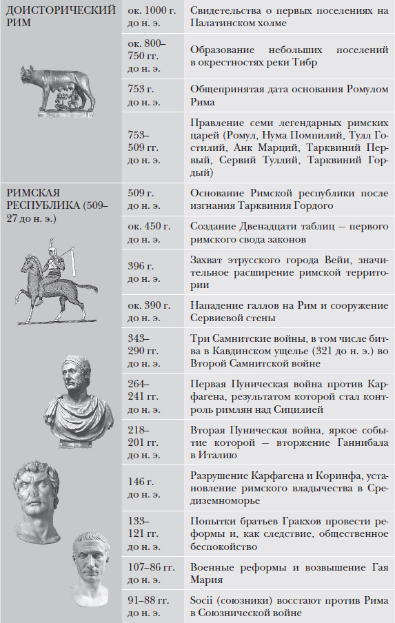 Ромул, Рем и волчица / Cebas / iStock; Самнитский воин / Sunny Celeste / Alamy Stock Photo; Ганнибал / Fratelli Alinari / Wikimedia Commons; Сулла / Wikimedia Commons; Цезарь / Wikimedia Commons; Алтарь Мира (Ara Pacis) / piola666 / iStock; Ian Dagnall / Alamy Stock Photo; Термы Каракаллы / фотография автора; Колонна Траяна / Matthias Kabel / Wikimedia Commons
