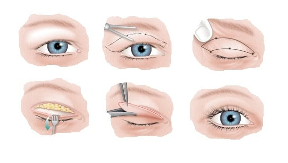 Представленная операция проводится при избыточном нависании кожи над глазными яблоками, а также при выпячивании грыжевых пакетов над глазами. Процедура выполняется под местной анестезией. Разрез проводится вдоль естественной кожной складки на верхнем веке. Ушивается шов внутрикожно, а вдоль линии разреза наклеиваются специальные пластырьки в цвет кожи. Они снимаются на 5-е сутки после операции. (РИС.9) Синячки и отек полностью проходят к 12—14 суткам.