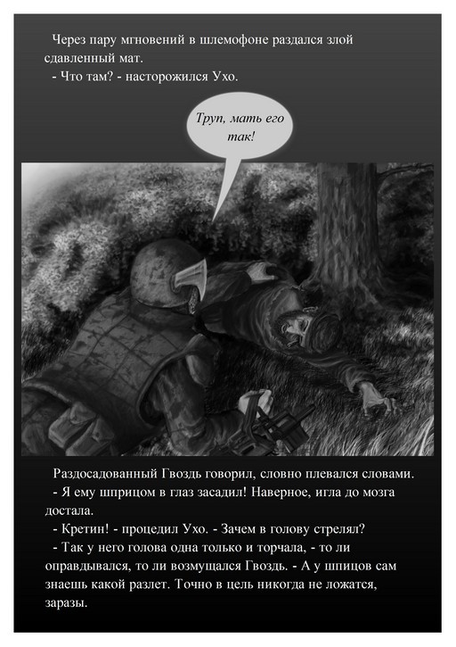 – Рассредоточится, – быстро заговорил Ухо, не глядя на подчиненных и настороженно зыркая глазами по хуторским улицам. – Проверять каждый дом. Действовать парами. Прикрывать друг друга. Соседей из виду не упускать. Диких валить нелеталкой. При обнаружении очагов сопротивления самим на рожон не лезть – блокировать и сообщать мне. На отрытые пространства не высовываться. Под пятиэтажку не подставляться. Заходим к центру слева. И под ноги смотрите, а то тоже напоритесь, как Гвоздь.