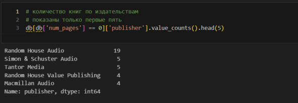 Код выше весьма любопытен. Как его прочитать? Берем таблицу db. В этой таблице ищем такие строки, в которых столбец равен 0. Далее, в отфильтрованной таким образом таблице, берем столбец ’publisher’. После этого вызываем value_counts для подсчета количества и head для ограничения вывода результатов.
