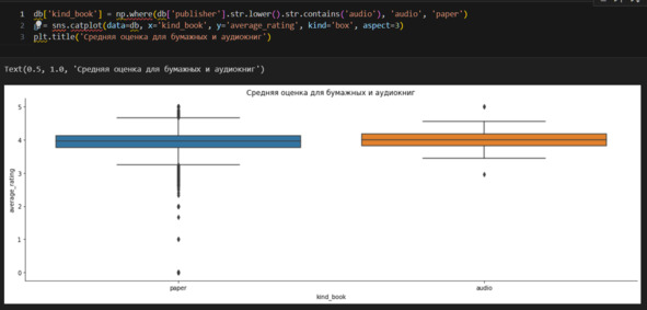 Вижу, что медиана не отличается, хотя разброс оценок для бумажных книг больше, чем для аудиокниг. Удалю вспомогательный признак, а также все аудиокниги. Надо учитывать, что такой подход, когда сравниваются две категории книг по графикам, является довольно грубым. Здесь бы стоило применить, например, t-тест. Но у меня нет специальной задачи исследовать аудио- и бумажные книги, поэтому ограничусь графиками.