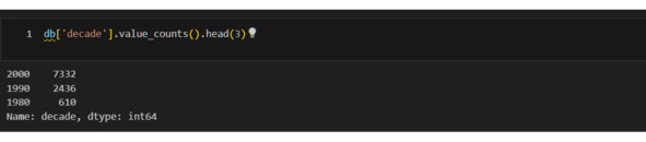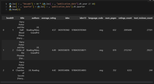 Чтобы получить значение десятилетия, я использовал код 10 * (db. loc [:, «publication_date»].dt. year // 10). Почему? В этом коде я сначала делю год на 10, причем оставляю только целую часть. Например, если год 2001, то получаю 200. А затем уже умножаю на 10 это «целое» число, что и дает декаду.