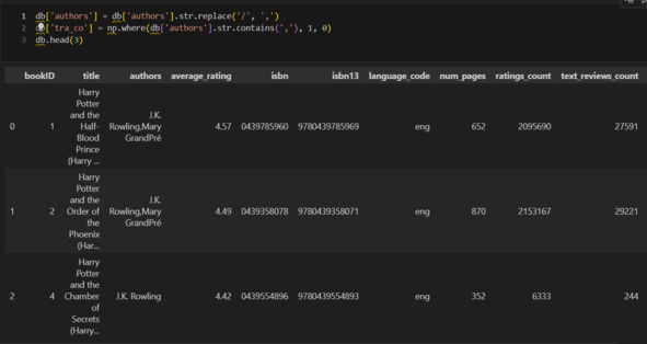 Из примеров видно, что, как правило, через слеш указаны переводчики. Однако возможны и другие ситуации. Это могут быть соавторы или вариант написания имени. Без дополнительного исследования внешних источников это определить нельзя. В этой ситуации можно сделать следующее. Заменю слеш на запятую. Создам колонку tra_co (переводчик или соавтор) и присвою 1 тем случаям, где есть запятая, и 0 остальным.