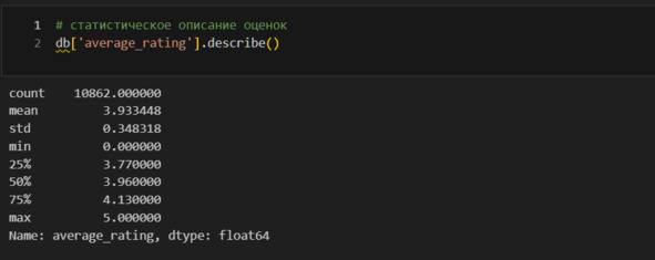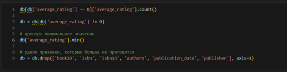 Минимальная оценка это 0. Но на сайте нельзя поставить такую оценку. Поэтому 0 означает отсутствие оценки, то есть это категориальный признак, который «пробрался» в числовой. Посмотрю количество и удалю, так как такое смешение недопустимо. Однако, если оценка 0, но количество оценок не 0, то это просто ошибка. Проверю это.