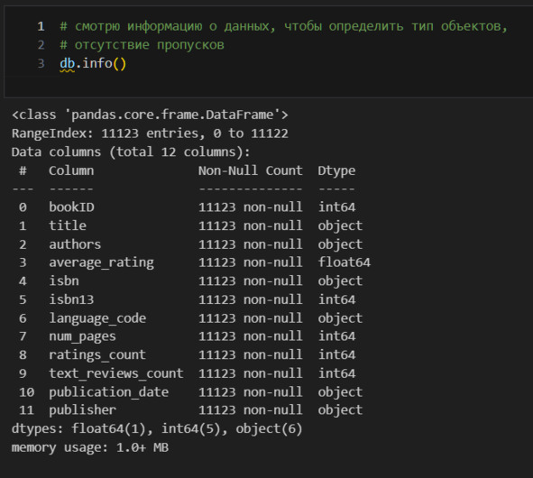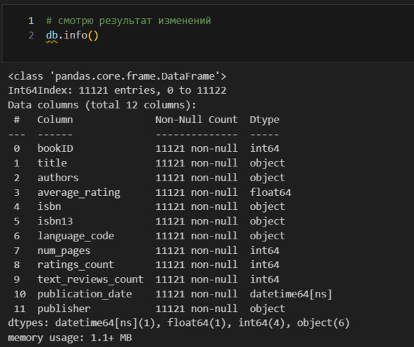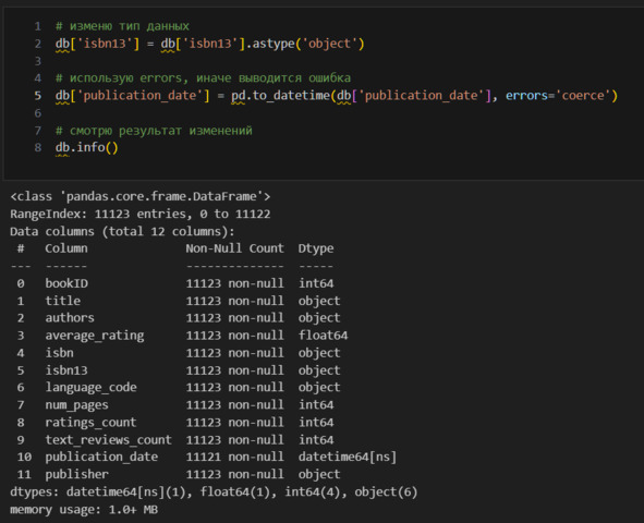 Вижу, что есть 12 признаков (нумерация начинается с 0 и продолжается до 11) и 11123 наблюдений (строк). Пропусков нет (количество объектов по столбцам одинаковое). Индекс у нас это RangeIndex. По типам данных заметно две проблемы. isbn помечен как объект, а isbn13 как int64. Кроме того, publication_date помечен как объект, хотя это очевидно дата. Изменю тип данных.