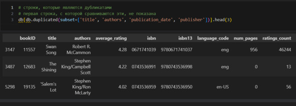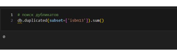 Теперь я должен заняться дубликатами строк. Я могу искать либо полные дубликаты (данные в каждом столбце для строки полностью совпадают), либо искать дубликаты выборочно. Здесь надо обратить внимание, что isbn является уникальным идентификатором каждой изданной книги. Поэтому логично искать дубликаты только по этому признаку, так как книги вполне могут совпадать по иным признакам и это нормально.