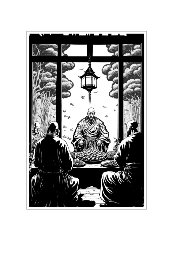 Послушники провели Сонциана в главную залу, где его ожидали настоятель, трое старших монахов и семнадцать блюд монашеской кухни. Увидав такое роскошество, Сонциан ахнул и рассыпался в похвалах, подмечая, как ровно выложены на тарелке наполовину обжаренные кукурузные початки, какой благородный тон у жасминового риса, как блестят маринованные сливы и как изящно вырезаны лепестки пионов из капустных листьев.