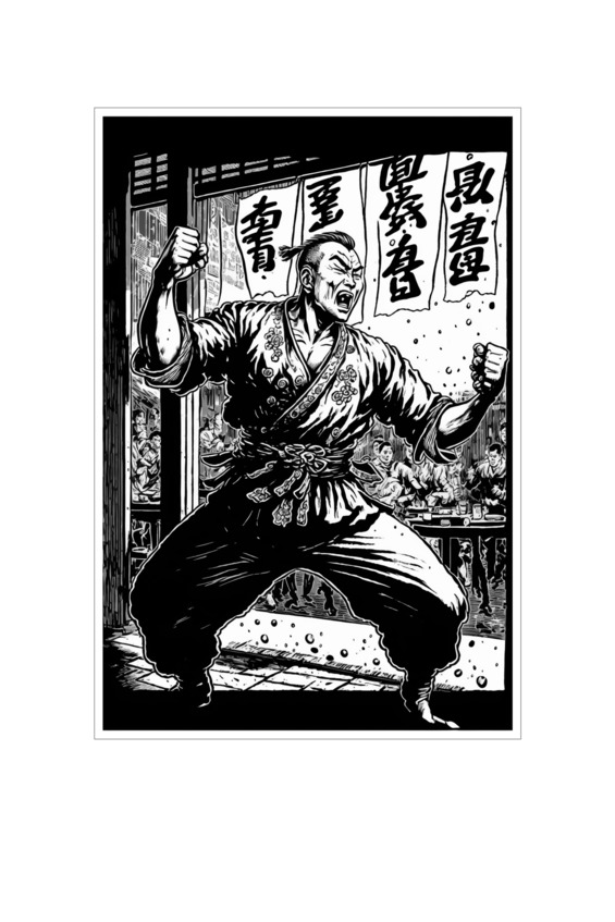От удара из глаз Люцзы вылетели искры, а из ушей пошёл пар. Он вскочил, перевернув стол, и завязалась драка. Испуганные посетители жались по углам. Стражники летали по всей таверне. Не успевал один из них встать, как его хватал взбешённый Чжу Люцзы. Далее несчастный стражник либо продолжал свой полёт до ближайшей стены, либо встречался головой с одним из деревянных столов или же оказывался со всей силы вмазанным в пол.