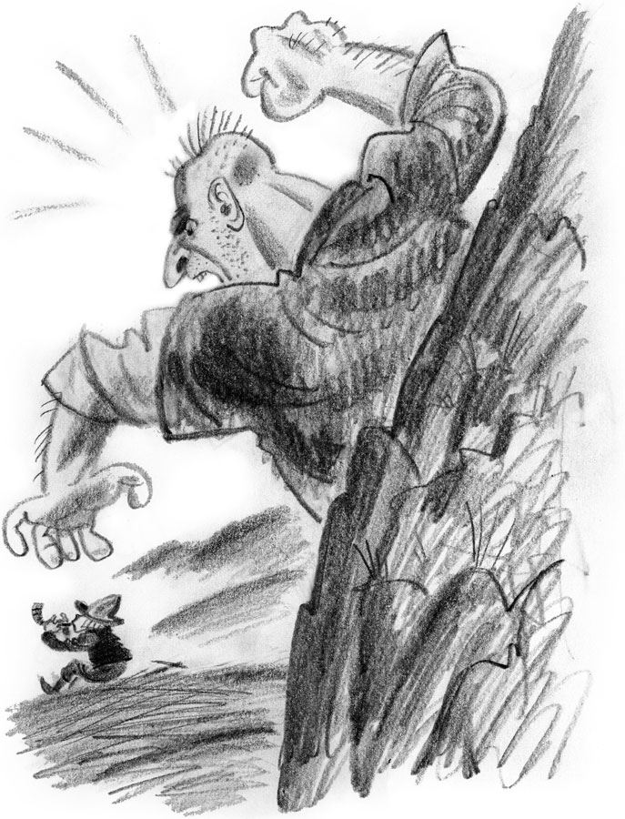 This noise roused the Giant, who rushed from his cave, crying, “Hey you, have you come here to disturb my rest? You shall pay dearly for this.[121] I will have satisfaction! I will take you whole and broil you for breakfast.”