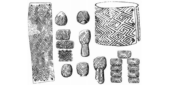 The Mesolithic period that followed the Paleolithic remains, until today, a white spot in the history of ornamentation. At this time, the researchers note, there was a widespread transition of the population of Eastern Europe from settledness to a mobile, wandering existence, which is probably due to the disappearance of the mammoth, which was the main object of hunting. Thus, products from tusks and mammoth bones were no longer produced, while ceramics appeared only in the Neolithic. But we have no reason to believe that the Paleolithic ornamental motifs, in particular the meander ornament of the Mezinsky site, disappeared forever. Probably, in the Mesolithic ornamental tradition continued to exist and develop on products made of such materials as leather, birch bark, wood, plant fibers. This is evidenced, for example, by patterns on wooden products of the Mesolithic age (7—6 thousand BC) found in the 1st Visa peatland near Lake Sindor in the Komi Autonomous Soviet Socialist Republic. These patterns of zigzags, parallel lines and oblique mesh are repeated without changes then on the Neolithic Kargopol ceramics.