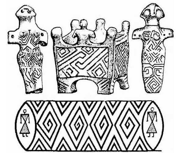At the many Neolithic sites of Ukraine, one of the most common at that time was a positive-negative meander ornament: fragments of ceramics from the Mitkov and Bazkov islands, from the settlements of Gayvoron-Polizhok, Vladimirovka are decorated, as a rule, with a complex meander pattern (Table 2.3). Published these materials V. N. Danilenko noted that such ornamentation is only partially modified, without disappearing for millennia. He writes: “There is no doubt that such an ornament is preceded by a spiral meander ornament of the later stages of the development of the agricultural Neolithic. At the same time, it is obvious that precisely such ornamental compositions, despite their exceptional antiquity, are already close to Early Tripoli. The last circumstance has to be explained not so much chronological how much ethnocultural proximity of the local early Neolithic with Tripoli.”