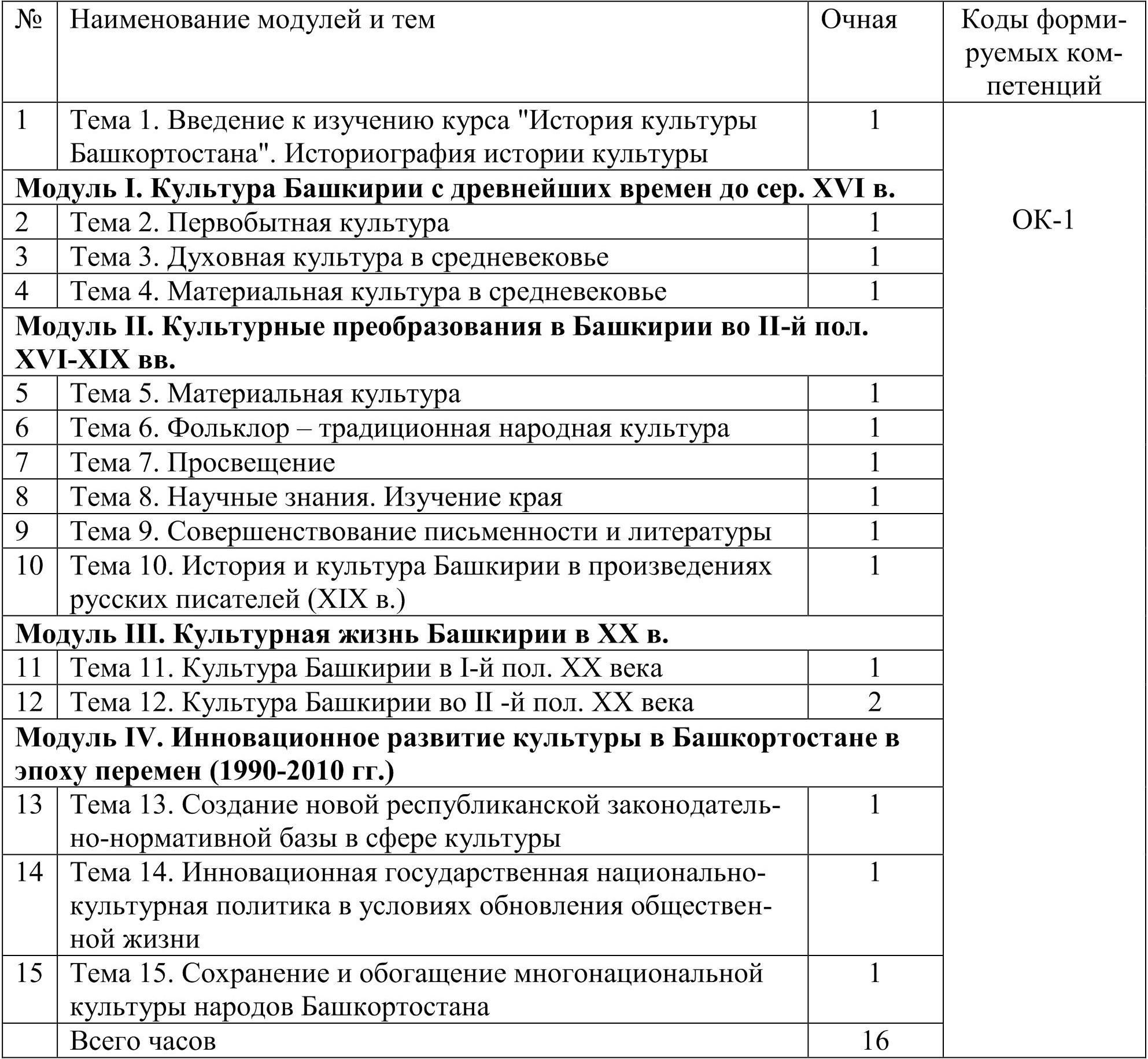 • закономерности, основные события и особенности истории культуры России, Башкортостана с древнейших времен до наших дней в контексте европейской и общемировой истории культуры, историю становления и развития государственности, общие культурно-ценностные ориентиры и историкокультурное наследие России и Башкортостана, основные политические, социально-экономические и духовно-культурные направления и механизмы, характерные для исторического и культурного развития и современного положения Российской Федерации и Республики Башкортостан, отечественной и региональной культуры;