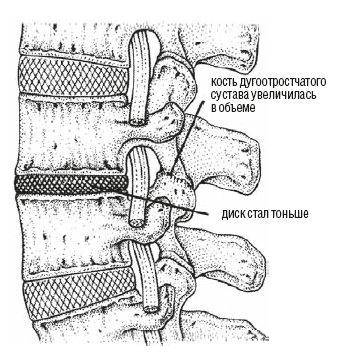 По мере того как диск в переднем комплексе позвоночника истончается, усиливается давление на места соединения суставных отростков смежных позвонков (такие места называются дугоотростчатыми суставами) в заднем комплексе позвоночника. Верхний позвонок опускается на нижний, и в результате те кости, которые должны лишь мимолетно соприкасаться, трутся друг о друга. Сначала это вызывает воспаление мягких околосуставных тканей, но со временем приводит к артритическим изменениям, поскольку стирается покрывающий кость хрящ. Изменения в дугоотростчатых суставах также нередко вызывают слабые боли в спине.