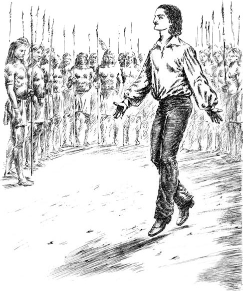 Надо было действовать, на что-то решаться. Рядом со мной сидел мой приятель Джордж Кинен, тоже ирландец. Он сохранил в своём мешке маленькую деревянную флейту. Мы выскочили на середину площадки, и Джордж заиграл на флейте. А я – умирать, так умирать – пустился в пляс, выбивая пятками джигу. Мной овладело отчаянное чувство безрассудства. Надо опробовать танец на этой дикой аудитории. Никогда прежде мне не приходилось танцевать с такой страстью, с таким огнём и в таком темпе. Туземцы сохранили на мне часть одежды: широкие матросские брюки, рубашку с открытым воротом и матросские ботинки. Это был военный танец. Я чувствовал себя воином, идущим в последний бой.