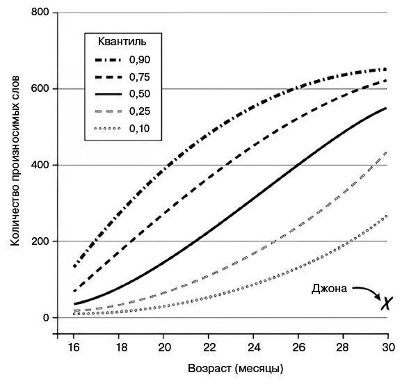 Она с тревогой наблюдала за тем, как педиатр проводит различные тесты. Врач видела, что мать Джоны обеспокоена, и решила, что стоит познакомить ее с графиком, показывающим, насколько неодинаково дети осваивают речевые навыки{2}: