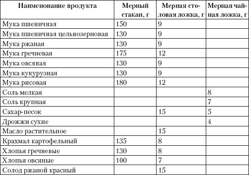Рецепты в книге приводятся в разных мерных величинах: в граммах, а также в столовых (чайных) ложках и стаканах (имеются в виду мерные ложки и стаканы). С помощью таблицы вы сможете легко перевести одни единицы измерения продуктов в другие.