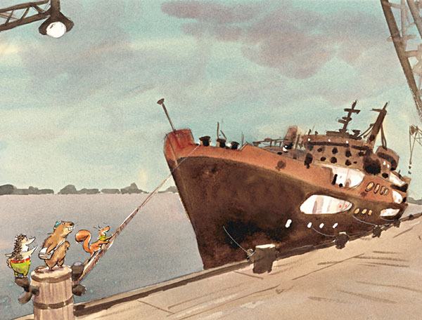 Навострив уши, они двинулись дальше. Волны шумели всё громче, ветер крепчал. Тёплый свет фонарей остался далеко позади, и небо над головами друзей казалось угольно-чёрным. Подъёмные краны, призрачные очертания которых напоминали монстров из ночных кошмаров, тянули к ним стальные руки. Море рокотало теперь совсем близко. Они осторожно пробирались между железнодорожными вагонами и грузами, стараясь не терять из виду маленькую движущуюся точку – большое судно, выставленное у береговой насыпи.