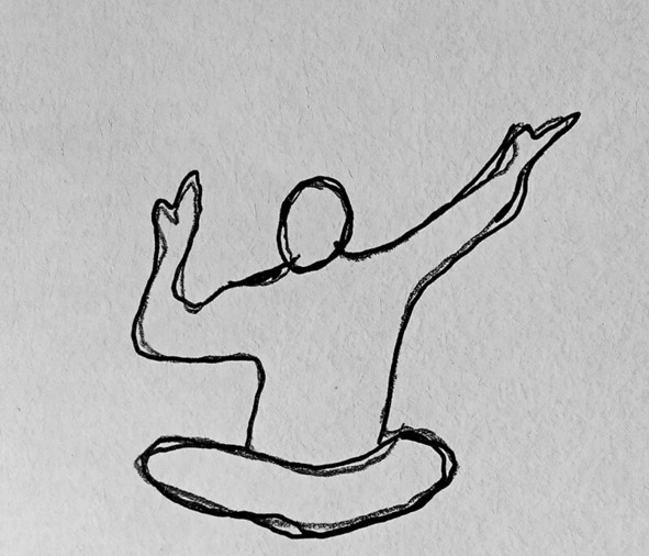 Простая поза сидя, левая рука в гьян мудре и поднята вверх и в сторону, правая рука согнута в локте и расположена возле уха в сурья мудре – большой палец и безымянный соединены, остальные пальцы направлены вверх.