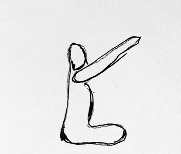 Простая поза сидя, руки выпрямлены вперед и вверх, ладони вниз, кончики пальцев выше макушки, большие пальцы переплетены, а остальные выпрямлены и смотрят вперед.