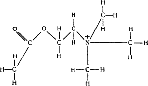 Ацетилхолин не очень крупная молекула. Она представляет собой цепочку, состоящую из одного атома азота, двух атомов кислорода, 7 атомов yглерода и 16 атомов водорода. На одном ее конце азот удерживает три метиловые группы (СН3). Эта группа несет положительный заряд. На другом конце находится сложноэфирная группа. А вся молекула имеет следующий вид:
