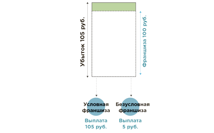 Франшиза бывает условной и безусловной (см. рис. 1.2). При расчете выплаты безусловная франшиза вычитается из любого страхового события в полном объеме. Условная франшиза не влияет на размер выплаты, она является индикатором: убыток меньше условной франшизы не выплачивается, а убыток больше условной франшизы выплачивается в полном объеме.