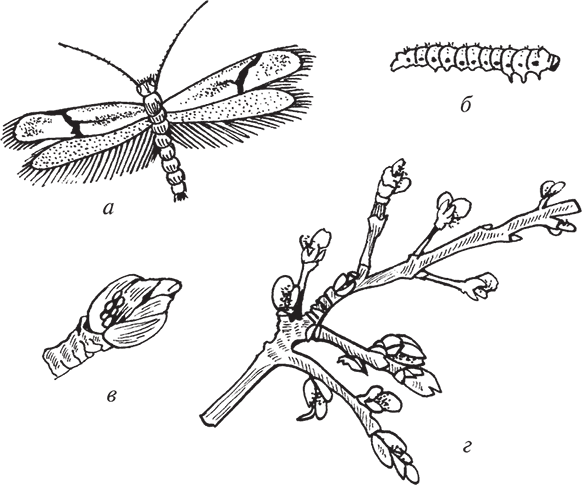 Бабочка вишневой моли небольшая, в размахе крыльев – 10–21 мм (рис. 18, а). Передние крылья ржаво-коричневого цвета с белыми продольными штрихами, задние – светло-серого. Гусеницы вишневой моли длиной 6–8 мм, имеют желтовато-зеленое тело с коричневой головкой, покрытое светлыми мягкими волосками (рис. 18, б). Вишневая моль повреждает почки, вызывая их отмирание или уродливость листовых пластинок (рис. 18, в, г). Поврежденные плодовые почки также отмирают. Даже если плодовая почка, поврежденная вредителем, выбрасывает соцветие, ее бутоны не развиваются и быстро усыхают.