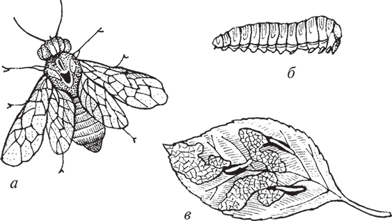 Вишневый пилильщик повреждает вишню, черешню, сливу, абрикос, терн, персик, иногда грушу. Взрослое насекомое имеет тело черного цвета длиной 5–7 мм, стекловидно-прозрачные крылья, которые в размахе достигают 10–12 мм (рис. 19, а). Взрослая личинка (ложногусеница) желтовато-зеленого цвета с черной головкой (рис. 19, б, в). После первой линьки она покрывается липкой слизью черного цвета и становится похожа на небольшого слизня. Зимуют взрослые личинки в землистом коконе в почве под кронами деревьев. Они окукливаются поздней весной, а в июне – июле из коконов вылетают взрослые пилильщики.