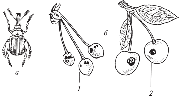 Рис. 20. Вишневый слоник: а – жук; б – плоды, поврежденные слоником: 1 – в период питания; 2 – в период яйцекладки