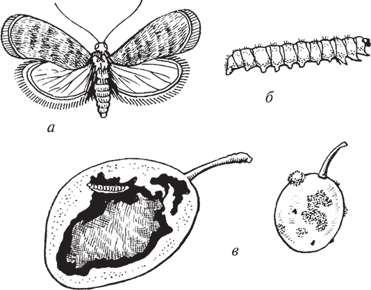 Рис. 21. Сливовая плодожорка: а – бабочка; б – гусеница; в – плоды, поврежденные плодожоркой