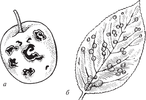 Рис. 22. Парша яблони: а – плоды, пораженные паршой; б – листья, пораженные паршой