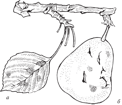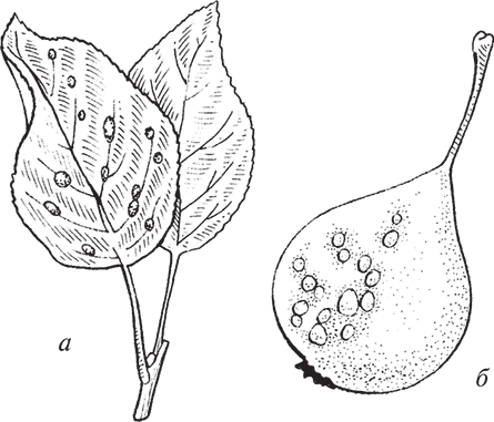 Заболевание вызывает преждевременный листопад и причиняет значительный вред плодовым деревьям. В июне на листьях образуются мелкие округлые или угловатые пятна бурого цвета, на верхней стороне которых можно заметить мелкие черные точки – шаровидные плодовые тела паразитного гриба (рис. 24, а). Внутри каждого плодового тела развивается множество грибных спор, которые ветром и насекомыми переносятся на здоровые листья, где они быстро проникают внутрь тканей. Зимует гриб на опавших листьях. Грушу часто поражает белая пятнистость. В конце июня на ее листьях появляются многочисленные беловатые пятна с темной каймой, на которых позднее можно увидеть черные точки – хранилища спор. К началу августа гриб стремительно развивается, поражая зачастую и плоды (рис. 24, б).