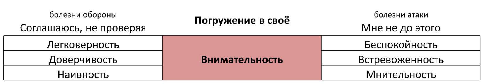В таком состоянии Внимательность тотально не работает. А зачем? Зачем ей погружать Вас в поиск информации, если она Вам не нужна, если Вы совсем о другом думаете, если Ваше желание – это не упасть в грязь лицом…