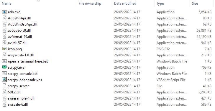 После распаковки содержимое папки scrcpy должно выглядеть следующим образом: