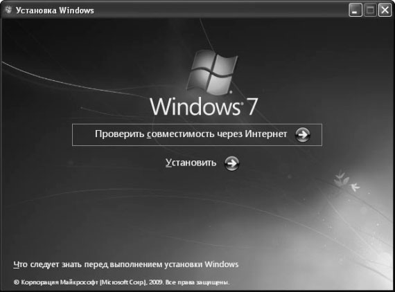 Если вы готовы к инсталляции Windows 7, вставьте в DVD-привод установочный диск. В появившемся окне щелкните на ссылке Установить (рис. 1.10) и выполните действия, описанные в подразделе «Вариант 1: установка Windows 7 как единственной ОС». Отличие будет заключаться только на первой стадии установки. Так, на этапе выбора типа установки для сохранения предыдущей версии Windows необходимо щелкнуть на ссылке Полная установка, а затем указать в качестве места инсталляции раздел, свободный от файлов старой операционной системы.