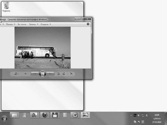 Взгляд Aero. В Windows 7 кнопка Свернуть все окна изменила свой вид и местоположение. Подробнее об этом мы поговорим ниже, а сейчас опишем потрясающий эффект, который появился у данной кнопки в этой версии Windows. Этот эффект называется Взгляд Aero. Подведите указатель мыши к кнопке Свернуть все окна. В результате все окна, развернутые на Рабочем столе, станут абсолютно прозрачными. О том, что они все еще открыты, будут напоминать лишь их контуры (рис. 2.8). Этот «взгляд» поможет вам быстро увидеть то, что расположено на Рабочем столе. Когда вы уберете указатель мыши с кнопки, все окна вернутся на прежнее место.
